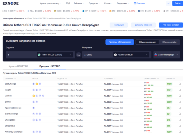 Для начала стоит подобрать подходящий криптообменник СПБ с помощью сервиса мониторинга Exnode. На платформе можно сравнить условия криптообменников в СПб, посмотреть доступные направления наличного обмена и выбрать оптимальный вариант под свои задачи.