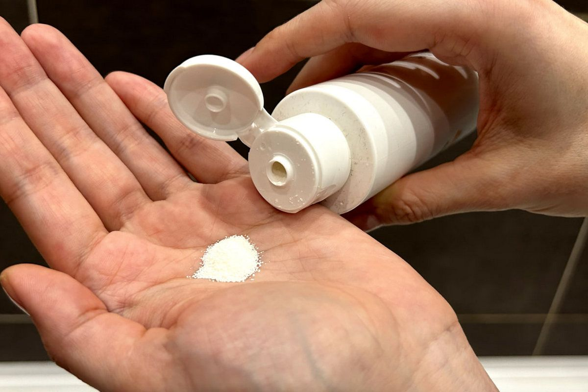 Это порошок, который при контакте с водой превращается в нежную пенку. Ферменты (энзимы) в его составе не царапают, а растворяют связи между омертвевшими чешуйками кожи. Если использовать пудру 2-3 раза в неделю, тусклый цвет лица останется в прошлом.