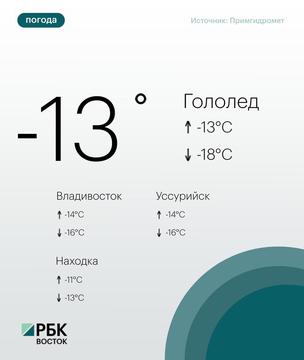 Местами небольшой снег. На дорогах гололедица, снежный накат. Ветер северный, северо-западный умеренный, на побережье местами сильный. Температура воздуха -13...-18°С. 🔹Во Владивостоке переменная облачность, без осадков. На дорогах гололедица. Ветер северо-западный умеренный до сильного, временами сильный. Температура воздуха -14...-16°C. 🔗 РБК Восток в Telegram и MAX