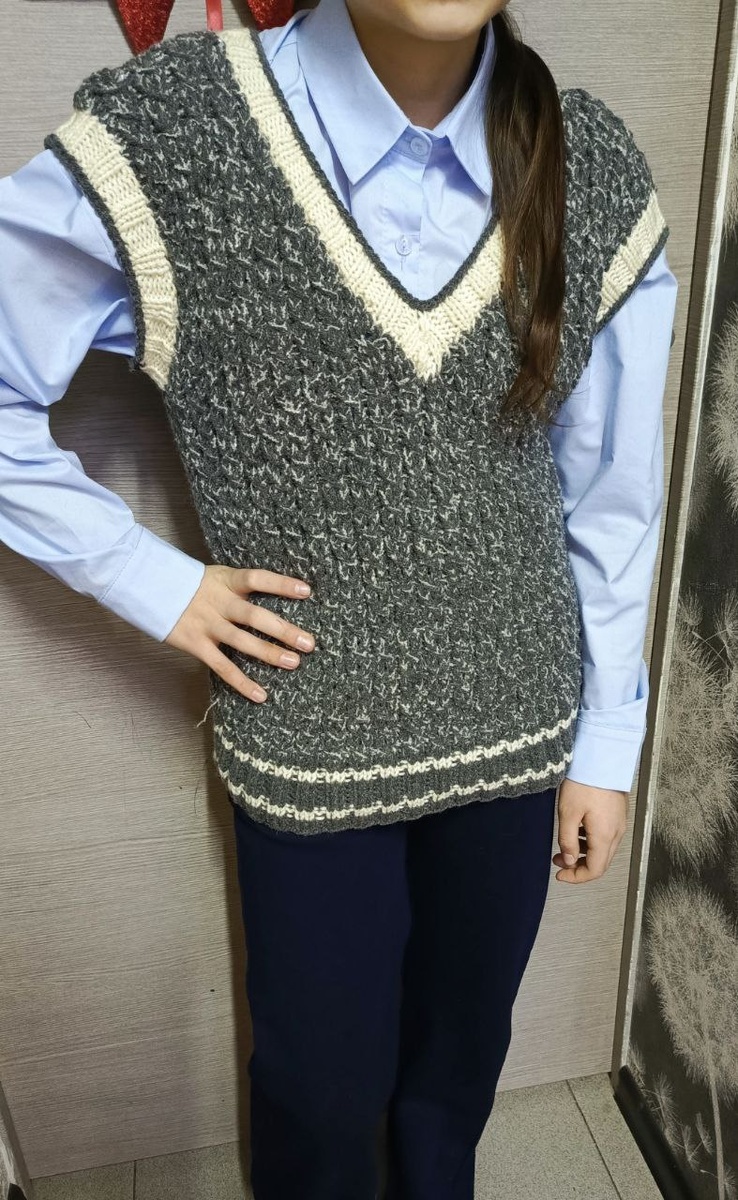 ). Такая жилетка украсит школьный образ и придаст ему классический, красивый вид. классический V-образный вырез гармонирует с рубашкой; нейтральные оттенки (серый с бежевыми вставками) универсальны и хорошо сочетаются с разной одеждой; вязаная текстура придаёт образу уюта, но при этом выглядит аккуратно и сдержанно. данном случае жилетка прекрасно сочетается с голубой рубашкой и тёмными брюками, создавая сбалансированный и аккуратный образ для школы. Если хотите сделать образ ещё интереснее, можно добавить: лаконичный аксессуар (например, брошь на рубашку); сумку с геометрическим принтом; яркие носки (как на фото — красные, они добавляют игривости). А вы любите носить жилетки ?