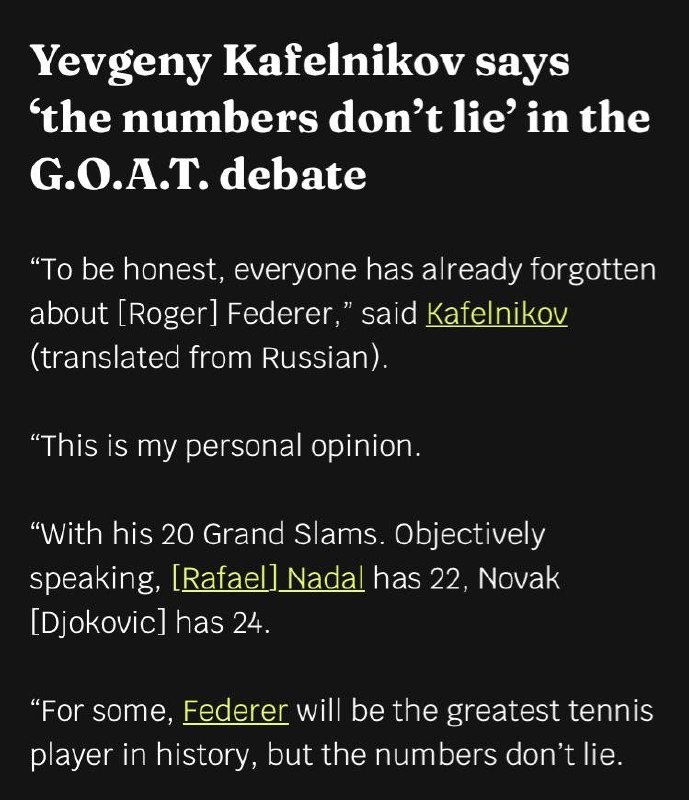 : «Если честно, все уже забыли о Федерере. У него 20 титулов Grand Slam. У Надаля - 22, у Джоковича - 24. Для кого-то Федерер навсегда останется величайшим теннисистом в истории, но цифры не врут». Подпишись на Эйс и точка