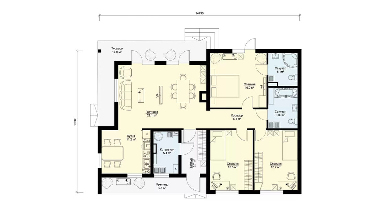 🏡 Представляем наш проект — дом МС-139! 🏡 Хотите уютный современный дом для всей семьи? Тогда этот проект именно для вас! ✨ Проект МС-139 — это просторный одноэтажный загородный дом 10x14 м с 4 комнатами (включая 3 спальни) и 2 санузлами, построенный из надежных железобетонных панелей БЭНПАН. Он идеально подойдет для постоянного проживания семьи из 4-5 человек. 🛋 Планировка включает: Крыльцо (9,1 м²) и тамбур (5,7 м²) Просторную гостиную (29,1 м²) и кухню (11,2 м²) Три спальни (от 13,5 до 16,2 м²), одна из которых с личным санузлом Общий санузел (6,3 м²) и котельную (5,4 м²) Террасу (17 м²) для приятных вечеров на свежем воздухе 🌿 Варианты перепланировки позволяют объединить спальни или отделить кухню — делайте дом уникальным под свои нужды! 🔗 Подробнее о проекте: https://benpan.ru/project/ms-139-odnoehtazhnyj-dom-s-terrasoj/?utm_source=dzen