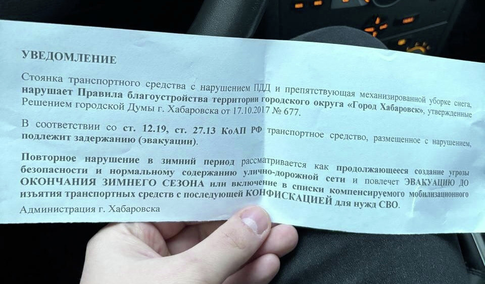 Хабаровчане обсуждают появление неких уведомлений от «администрации». В них сообщается, что личные транспортные средства средства будут эвакуированы из-за препятствий механизированной уборке снега на весь зимний период или вовсе конфискованы с последующей отправкой на СВО. Автолюбители отметили, что визуально уведомления выглядели почти как настоящие, со ссылками на всевозможные нормативные акты, что и ввело многих в заблуждение. - На каком основании администрация Хабаровска собралась изымать автомобили граждан? Чьи это листовки? — делятся обеспокоенные автолюбители. Другие жители города сразу засомневались в подлинности уведомлений. Действительно, распространяемые листовки оказались неизвестны местным властям. - Администрация города Хабаровска подобных уведомлений не распространяла, — сообщили в мэрии Хабаровска. Отметим, статья 35 Конституции РФ гарантирует защиту права частной собственности, разрешая владение, пользование и распоряжение имуществом единолично или совместно. Никто не