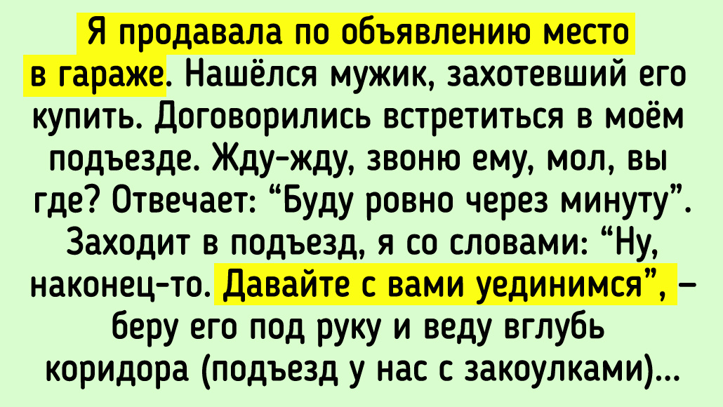 Казус из моей жизни. Собрались мы с друзьями (3 пары) слетать на майские праздники 2011 г. в Турцию. Но один из нас (Серёжа) должен был прилететь на следующий день, т. к. в день вылета была важная встреча. Самолёт — в 5 утра из Шереметьево. Перед регистрацией проверяем документы. И, о ужас! Оля (жена Серёжи) открывает паспорт и видит фото с усами! В спешке сборов перепутали сумки, а в них — паспорта. 3 часа утра, звоним Серёже. Он спросонья: — Уже отмечаете?! Дайте поспать. И положил трубку. Кое-как объяснили, что это не розыгрыш. Хорошо, что мы живём не так далеко (около 50 км), Серёжа успел привезти паспорт. Но в спешке он привёз только Олин паспорт, а сумку Оли со всеми её вещами оставил дома. Оля в Турции — с Серёжиными плавками, Серёжа в Москве — с Олиным купальником. Всё встало на свои места только на следующий день. Теперь у нас такая присказка: «Паспорта проверили?» © Бекар / Dzen Я продавала место в гараже по объявлению. Нашёлся мужик, захотевший его купить. Договорились встр