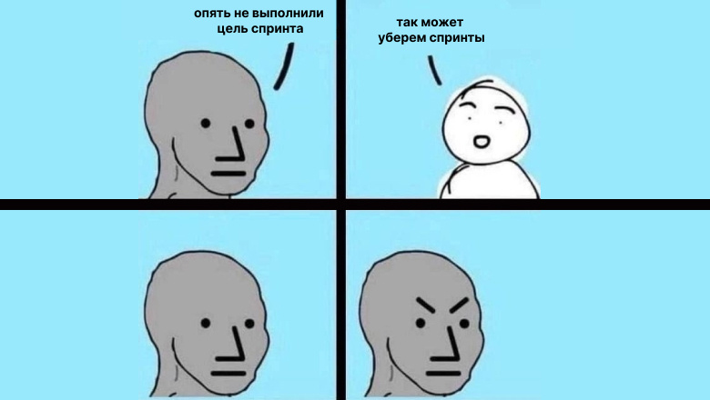 Последняя причина, почему все эти скрам-атрибуты теоретически могут появиться в командах, — это если сами команды нуждались в этом и ввели все осознанно. Но это какая-то фантастика, такого не бывает.