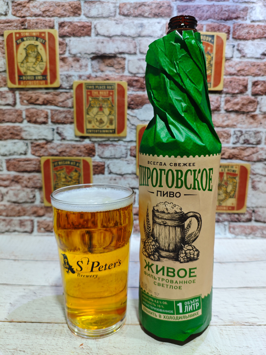 Когда я слышу слово "Пироговское" - первое, что мне приходит в голову: "кладбище". "Водохранилище" - на втором месте. Теперь же к моему скудному лексикону добавится ещё и Пироговское пиво. Сварила это пиво ЗАО "Московская Пивоваренная Компания" в г. Мытищи Московской области. На сколько я могу судить по отзывам на UNTAPPD, линейка пива "Пироговское" появилась в конце 2025 года и на данный момент включает в себя два сорта: "Пшеничное" и "Живое Светлое", о котором и пойдёт сегодня речь. К слову, пиво продаётся в ПЭТ объёмом 1л. На мой взгляд, странное решение, но судя по всему данную линейку будут позиционировать, как "разливное пиво". Пироговское Живое Светлое - это непастеризованное пиво со сроком годности 2 месяца. На самой этикетке написано: "Хранить в холодильнике", однако на обороте той же самой этикетки указана рекомендация хранения при температуре от +2℃ до +25℃. То есть как бы в холодильнике хранить и не обязательно. Что ещё... "Живое" в названии - лично у меня и не тольк
