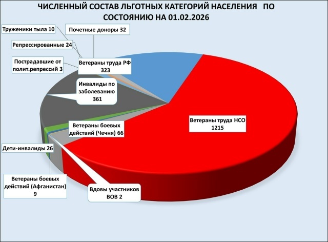 По состоянию на 1 февраля года в Комплексном центре социального обслуживания населения в Северном состоит на учете 2071 гражданин льготной категории. Из них наибольшую численность составляют «Ветераны труда Новосибирской области» — 1215 человек, «инвалиды по заболеванию» — 361, «дети инвалиды» — 26. Наименьший численный состав льготных категорий составляет: «Вдовы участников ВОВ» (жены умерших участников ВОВ) — 2 человека, «пострадавшие от политических репрессий» — 3 человека. В 2025 году в Северном районе уменьшение численности произошло в категории «Труженики тыла» на 6 человек и в категории «Ветеран боевых действий» на 5 человек, и составляет соответственно 10 и 75 граждан. В категории «Репрессированные» состоит 24 гражданина. С сентября 2025 года в Северном округе граждан категории «Чернобыльцы» нет. По сравнению с аналогичным периодом 2025 года численность льготных категорий уменьшилась на 41 человека. Уменьшение численности произошло во всех из учитываемых категорий, кроме «Ветер