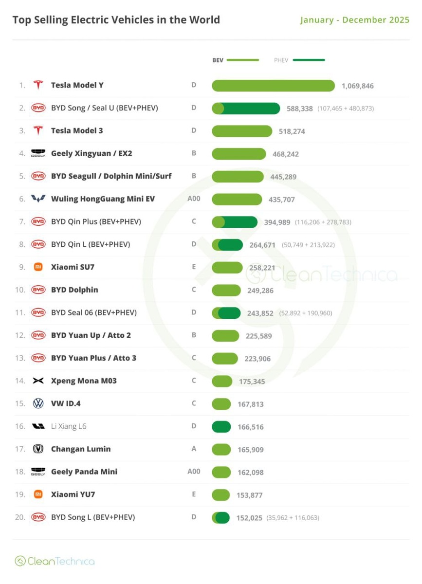 Несмотря на общее снижение продаж и потерю мирового лидерства в общем зачёте, Tesla Model Y остаётся на первом месте четвертый год подряд. Ранее это была Tesla Model 3 (с 2018 по 2021 год), и Nissan Leaf (2011, 2013, 2014 и 2016 годы). На втором месте оказался BYD Song, на третьем Tesla Model 3. Обе модели удерживают эти места четвертый год подряд. Вероятно, в 2026 ситуация изменится. Обратите внимание, все остальные места в 20-ке за одним исключением занимают китайские бренды — BYD, Xiaomi, Li Xiang, Geely, XPeng. Вторая таблица — вот как выглядел бы топ-20 модельных продаж, если исключить из него китайские авто (составлен без учёта продаж в Китае) 😉 Какие ставки на 2026 год? 🔥 — китайцы займут первые три места ⚡️ — китайцы займут первую десятку ❤️ — китайцы займут все 20 мест 📭Прислать новость @evforum | Наши чаты ⚡️#evСтатистика