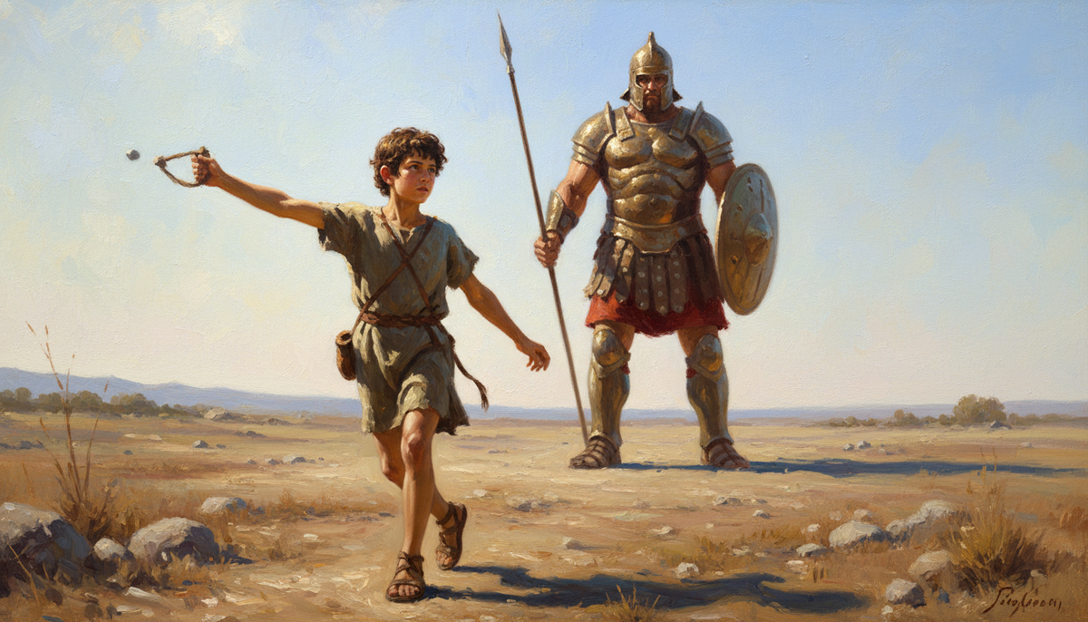 Давид был ещё мальчиком-пастухом, когда пришёл в лагерь. Он сказал царю Саулу, что победит великана. Взял пращу. Один камень. Метнул в лоб филистимлянина.