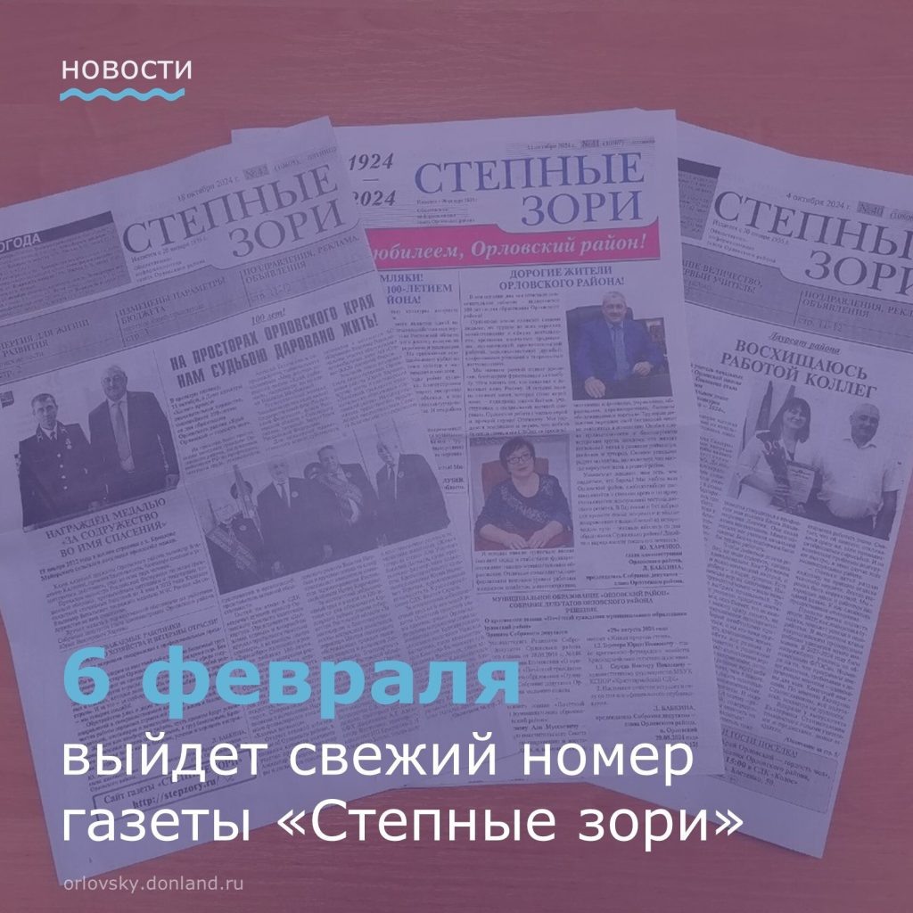 В свежем номере районной газеты «Степные зори» от 6 февраля читайте: – Помним! Блокадный Ленинград: ты прошёл через пламя и ад. В Орловском районе прошли памятные мероприятия. – Местное самоуправление: Предложены поправки в Устав района. – Региональный форум: Создай проект и воплоти. – Детский телефон доверия: Неделя внимания к важной проблеме! Узнайте, как получить бесплатную и анонимную помощь. – Акция «Блокадный хлеб»: Кусочек хлеба – цена за жизнь. – СВОих не бросаем! Вкусные гостинцы бойцам приготовили серебряные волонтёры движения «Наше поколение». – Год единства народов России открыли в Орловской школе №1. – Важно знать: Идёт отбор граждан в подразделения войск беспилотных систем. – Литературная страница: из творчества местных авторов. – Абитуриентам: О поступлении в образовательные организации МВД России. – Прокуратура информирует о проведённых проверках. – Берегите здоровье: Ботулизм смертелен! Также в нашей газете ТВ-программа, актуальные объявления и реклама. Контакты: +7 (8