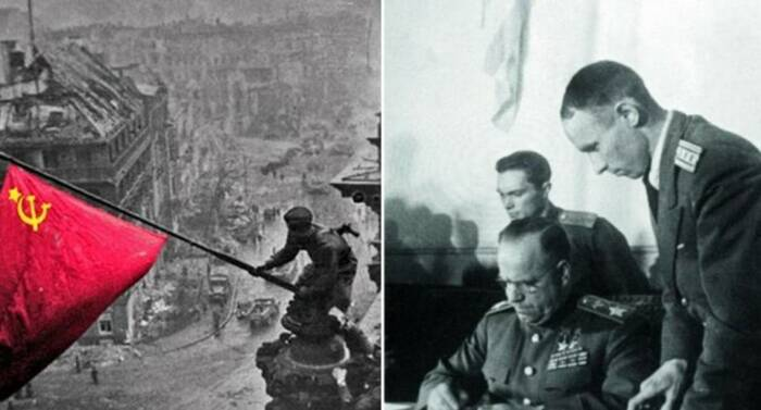 Немецкая армия оттеснялась в Германию, британцы и американцы освободили южную часть Италии, затем союзники высадились в Нормандию, а с востока наступали советские войска. Гитлер наложил на себя руки, потому что испугался попасть в плен к русским, Красная Армия которых уже достигла стен рейхстага. При этом, каким боевым путем красноармейцы шли до Берлина автор сообщить не счел необходимым. Будто бы речь идет только о необходимости доехать до Берлина, а не вести ожесточенные боевые действия за каждый клочок земли. В общей сложности, особенно после того как в учебнике говорится о том, что Гитлер вместе с «советским диктатором» пришли к секретному соглашению и оккупировали Польшу в 1939 году, складывается впечатление, что война возникла не в результате вероломного нападения одной страны на другую, а в результате политических противоречий.