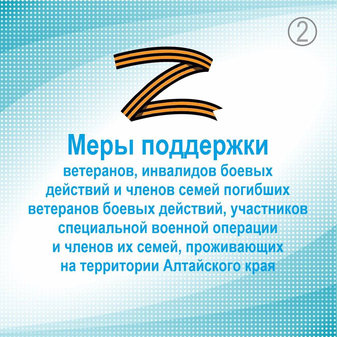 операции и членов их семей, проживающих на территории Алтайского края. ☑Подробнее смотрите в карточках #Алтайскийкрай #Минсоцзащита_22 #МерыподдержкиучастниковСВО
