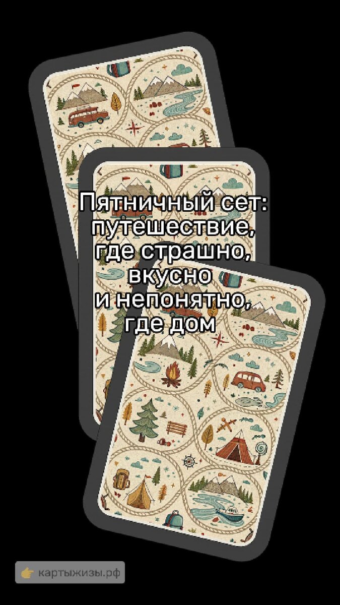 «Тревел Таро» — это карты про поездки без глянца: ночёвки с подозрительными шорохами, шведские столы без тормозов и возвращения, после которых уже не совсем понятно, куда именно вы вернулись. У каждой карты есть прямое и перевёрнутое значение и маленький дорожный намёк. Сегодняшний пятничный сет напоминает: в пути вы можете бояться, объедаться и теряться — но именно так и рождаются истории, которые потом становятся «помнишь, как…». 🌲 Лес ночью — вдохновение рядом со страхом, и вилка вдруг ощущается средством самозащиты. 🍹 Всё включено — радость без границ, но границы брюк всё же существуют. 🧳 Граница — формально вы вернулись, но внутренне уже чуть-чуть другой человек. Хочется ещё дорожных знаков и путешественных инсайтов? Заглядывайте на картыжизы.рф #картыжизы #пятничныйсет #тревелтаро