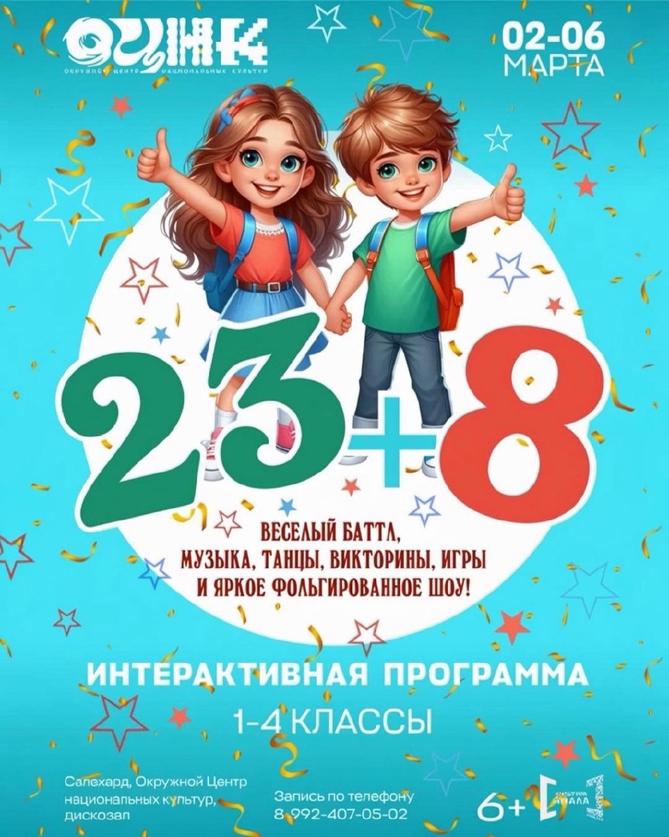 ! 🥳 Приглашаем учеников 1-4 классов на «23+8» — самую КЛАССную вечеринку этой весны, которая пройдет со 2 по 6 марта! 🌷 Что вас ждет на празднике? Настоящая битва талантов и смекалки! Будем проверять музыкальный слух, интуицию и танцевальные способности. Никаких скучных посиделок — только драйв, игры и серебряный вихрь фольгированного шоу! 🪩 💰Стоимость участия: 1000 руб. 📲 Справки и бронь по телефону: 8 (992) 407-05-02 Успейте забронировать лучшее время для своего класса! #ОЦНК #Салехард #КультураЯмала #ФевроМарт