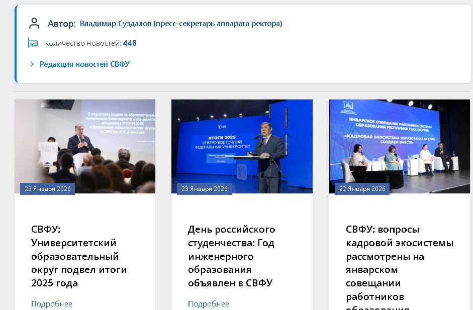 На сайте университета обновлён механизм навигации по новостям: 🚫 Было: фильтрация только по редакторам (кто разместил материал). ✅ Стало: поиск по авторам (кто подготовил материал). ✨ Что это даёт: • 🔎 Быстрый поиск всех публикаций конкретного автора; • 👥 Включение как архивных авторов с 2013 года (от 200 публикаций), так и действующих сотрудников. 📣 *Пример - Информация от пресс‑секретаря ректора СВФУ* https://www.s-vfu.ru/news/authors/?author=1 Этот раздел вызывается в любой новости главного раздела. в самом низу - есть ссылка на автора. http://t.me/blog0902