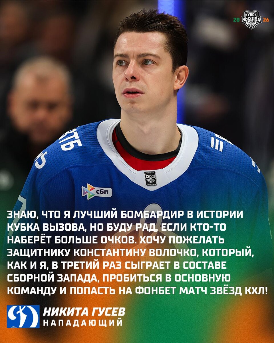 » Никита Гусев до сих пор является лучшим бомбардиром и ассистентом в истории Лиги, удерживая лидерство, обеспеченное ещё 13 лет назад. За три полноценных сезона в МХЛ он записал на свой счёт 255 (103 + 152) очков в 160 матчах Гусев — лучший бомбардир (2+2) в истории Кубка Вызова и пока что единственный хоккеист, трижды принявший участие в этом мероприятии. Уже сегодня его достижение повторит защитник «Динамо-Шинника» и капитан сборной Запада Константин Волочко, который также в третий раз сыграет в матче лучших молодых игроков МХЛ. #КВ2026 🏆 @mhlrus