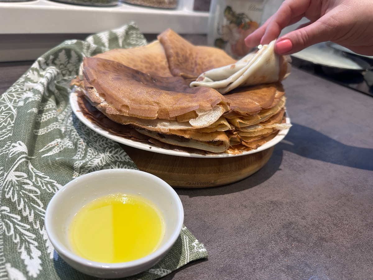 У мамы была привычка — она всегда складывала блины треугольничками. Не стопкой «солнышек», а именно аккуратными секторами. Так их было удобнее хватать на лету. А еще я в детстве терпеть не могла, когда блины смазывают маслом сверху. Вот этот жирный блеск меня почему-то отталкивал. Мама это знала и топила масло в отдельной плошке — для тех, кто любит.