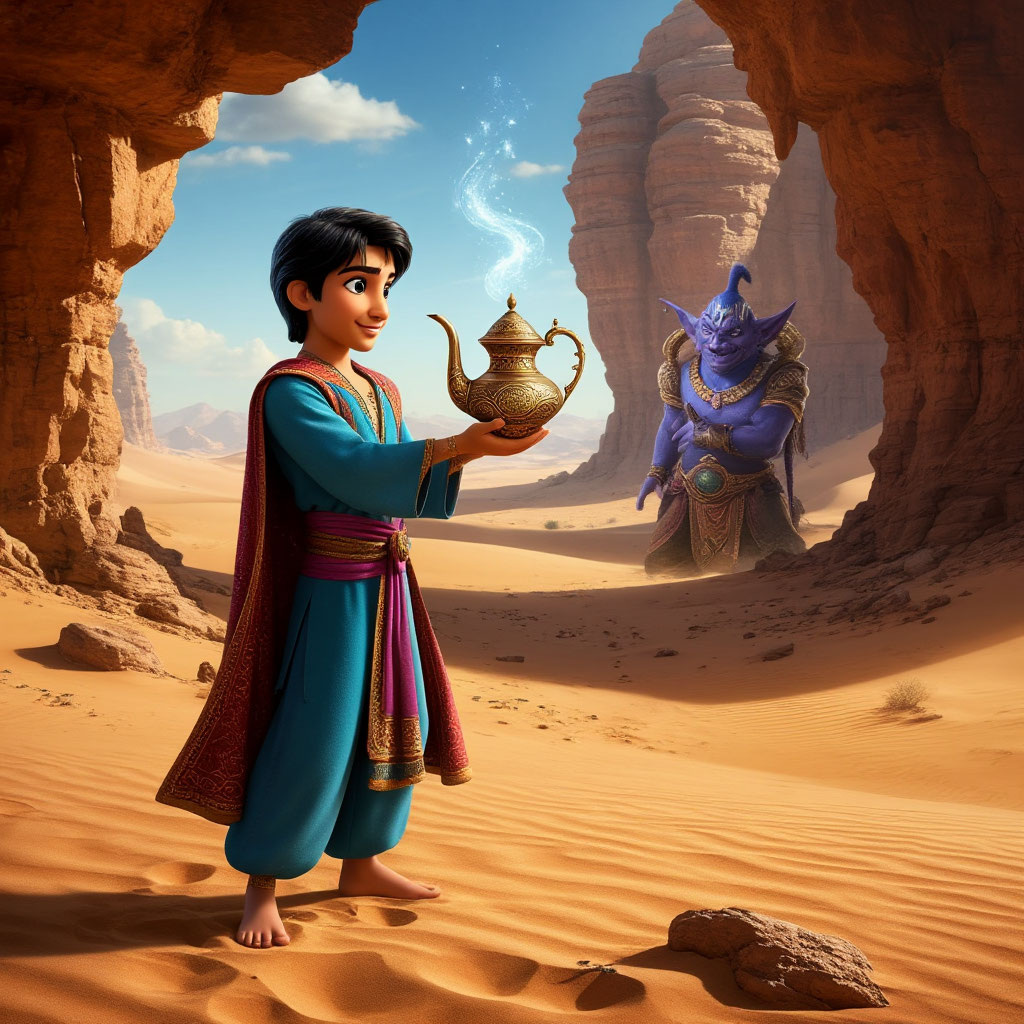 Алладин стоял посреди пустыни, держа в руках древнюю лампу, которую только что отыскал в заброшенной пещере. Он потер её, и перед ним появился Исполнитель желаний — существо, способное исполнить любое желание.