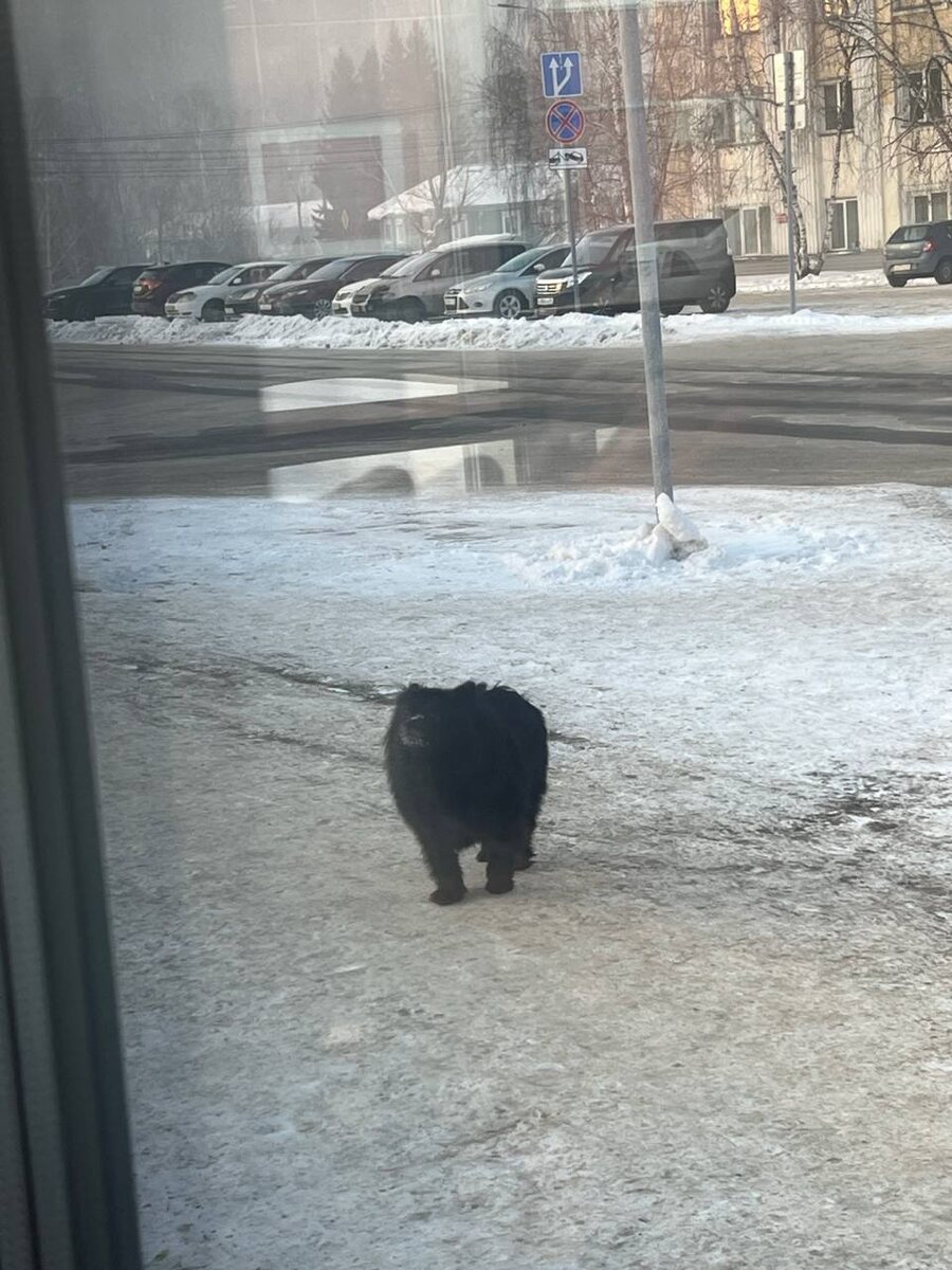 Возле кофейни по адресу Центральный переулок, 1А «Улала-Луна» бегает чёрный шпиц, видно, что ищет хозяина, бегает туда-сюда, но не отходит от кофейни.