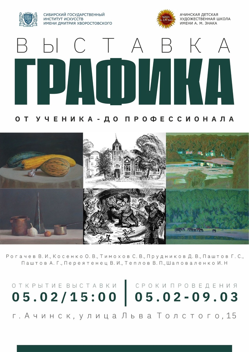 От ученика - до профессионала» в детской художественной школе им. А.М. Знака 🎨 5 февраля в выставочном зале Ачинской детской художественной школы им. А.М. Знака открылась выставка творческих работ преподавателей и учебных работ студентов кафедры «Графика» Сибирского государственного института имени Дмитрия Хворостовского «Графика. От ученика - до профессионала». Кафедра «Графика» основана в 1988 году в Красноярском государственном художественном институте, первым ректором, Заслуженным деятелем РФ, членом-корреспондентом РАХ В.Н. Петровым-Камчатским. Именно он сумел заложить те профессиональные и творческие навыки и идеи, которые до сих пор являются основополагающими для преподавательского коллектива кафедры. Руководителем кафедры является член Союза художников России, Заслуженный художник Российской Федерации, Заслуженный художник Республики Мордовия профессор Виктор Иванович Рогачев. На кафедре две творческие мастерские «Станковой графики» - под руководством Заслуженного художника