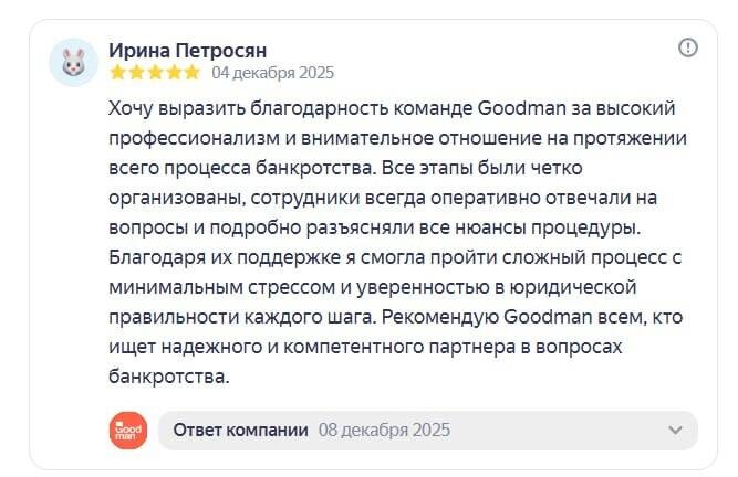 Был запрос не просто «оформить документы», а пройти весь путь юридически правильно, спокойно и без сюрпризов. С самого начала работа была выстроена системно: понятный алгоритм действий, чёткие сроки, прозрачные решения. Каждый этап процедуры сопровождался разъяснениями — без формальных отписок и сложных формулировок. Все вопросы клиента получали «оперативные и содержательные ответы», что особенно важно в ситуации, где любая неопределённость усиливает стресс. По словам клиента, именно постоянная поддержка команды Goodman дала ощущение уверенности: — что процесс под контролем, — что решения принимаются в рамках закона, — что каждый шаг выверен с юридической точки зрения. Это позволило пройти банкротство «с минимальным эмоциональным напряжением», сосредоточившись на жизни, а не на страхах и сомнениях. «Я чувствовала, что рядом не просто юристы, а команда, которая действительно отвечает за результат», — отмечает клиент. Для нас такие отзывы — подтверждение главного принципа работы Go