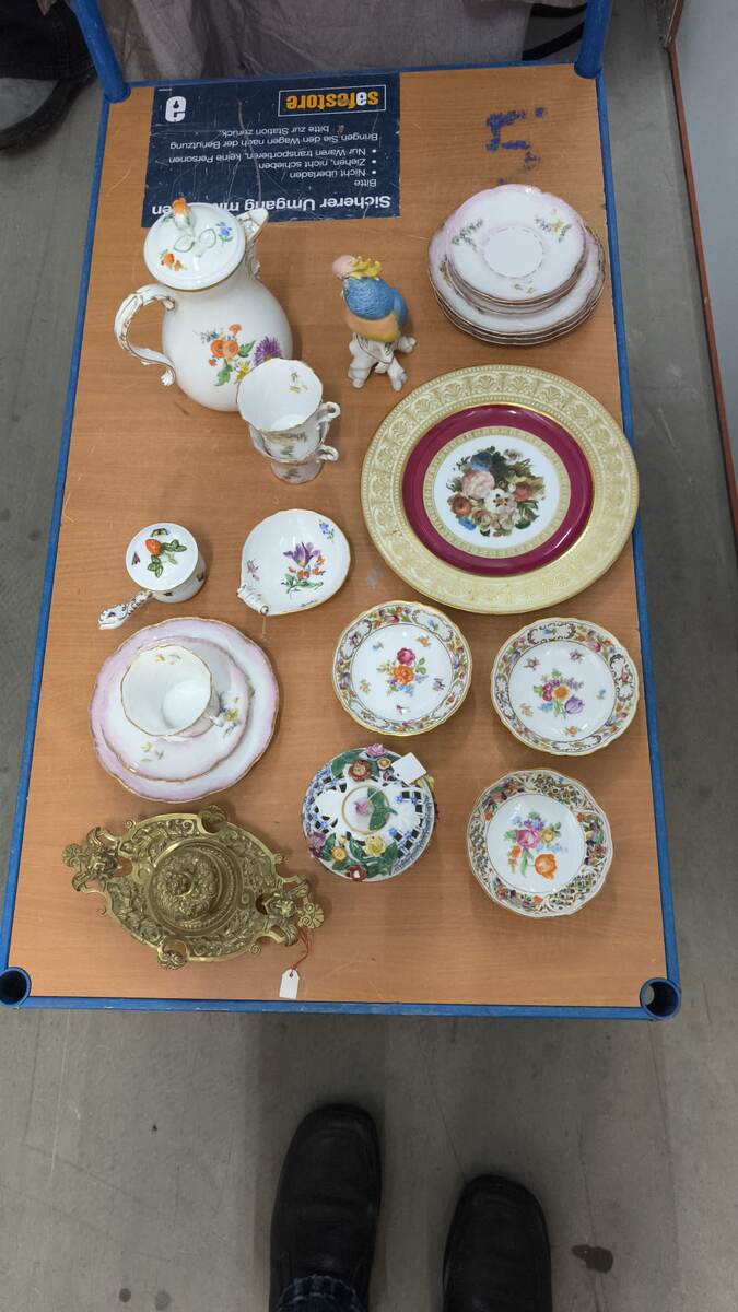 Зимние месяцы характерны спадом активности как на рынках, (продавцы, как правило уезжают к себе на Юг в Турцию или Сирию), так и подписчиков. Продавцы, как перелетные птицы, стремятся в более теплый климат к семьям и родственникам, туристов очень мало, а у наших подписчиков праздничные Новогодние и Рождественские заботы. Весной начинает просыпаться не только природа, но и активность подписчиков. И вот мы уже получили некоторые "хотелки". А если есть заказы, то нужно начинать работать. И вот наш любимый поставщик Маргарита Васильевна, (так она нам представилась), немного говорит, но замечательно понимает по русски, пригласила на свой склад. Складом оказалась "каморка" около 5 кв.м. забитая коробками и небольшим стеллажом с уже разобранным фарфором. Ну на безрыбье как известно...... Но ближе к теме. Это наш предварительный отбор. Декоративную тарелку, латунную чернильницу и попугая Энса пришлось оставить, зато добавился еще один Мейсенский кофейник. Один из ни