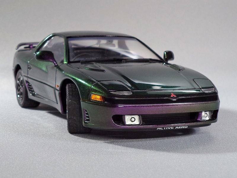 Грунтовал серым грунтом от AK. В качестве цвета кузова выбрал хамелеон от Тамии PS-46 "Iridescent Purple/Green", для подложки использовал черный Mr.HOBBY С2 Gloss Black. Перед нанесением PS-ки дал несколько дней просохнуть слоям черной краски, спрей нанес в 2 тонких слоя. Поверхность после хамелеона получается какой-то матовой с легкой шагренью, чем-то похожа на резину, и легко слезает при неосторожном движении. Игра цвета хорошо заметна, после лака эффект намного увеличивается. Лак - 2К от Splash Paints, полироли от Tamiya. По углублениям прошелся черной смывкой от Тамии. Из остальной химии - акрилы Tamiya, AK.