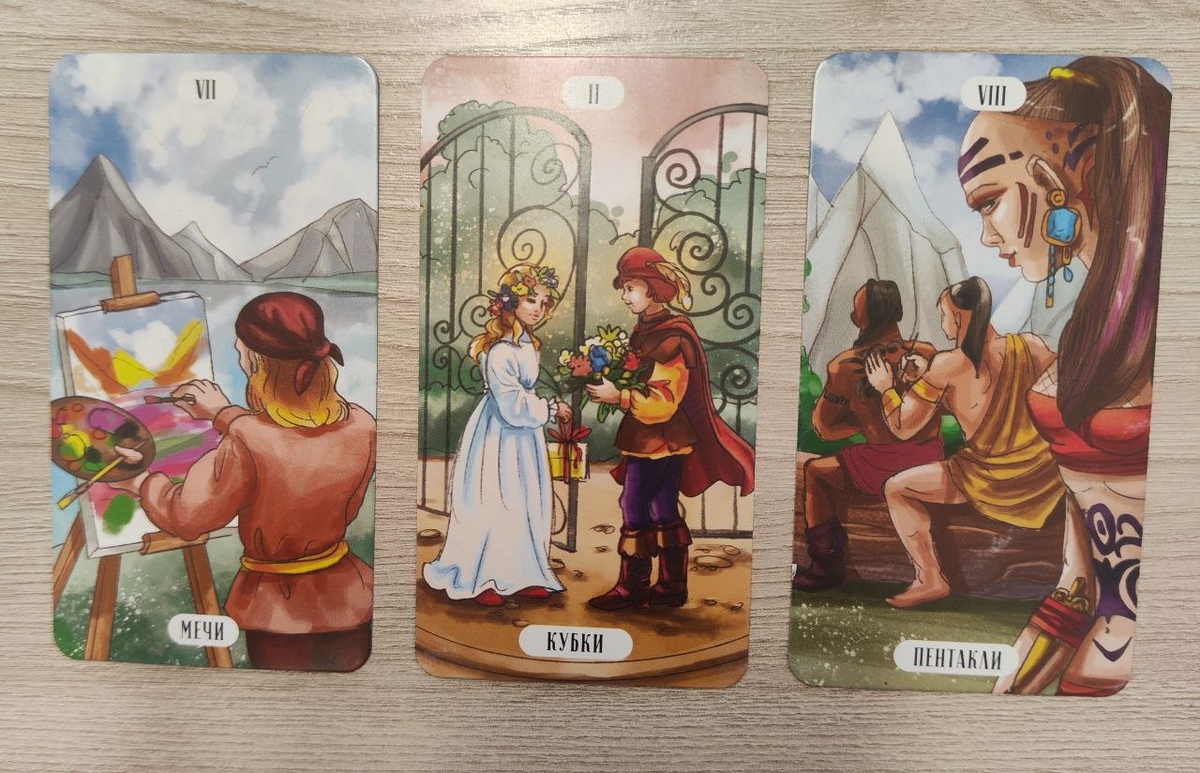 🌟 Карта Дня: Семёрка Мечей, Двойка Кубков и Восьмёрка Пентаклей
