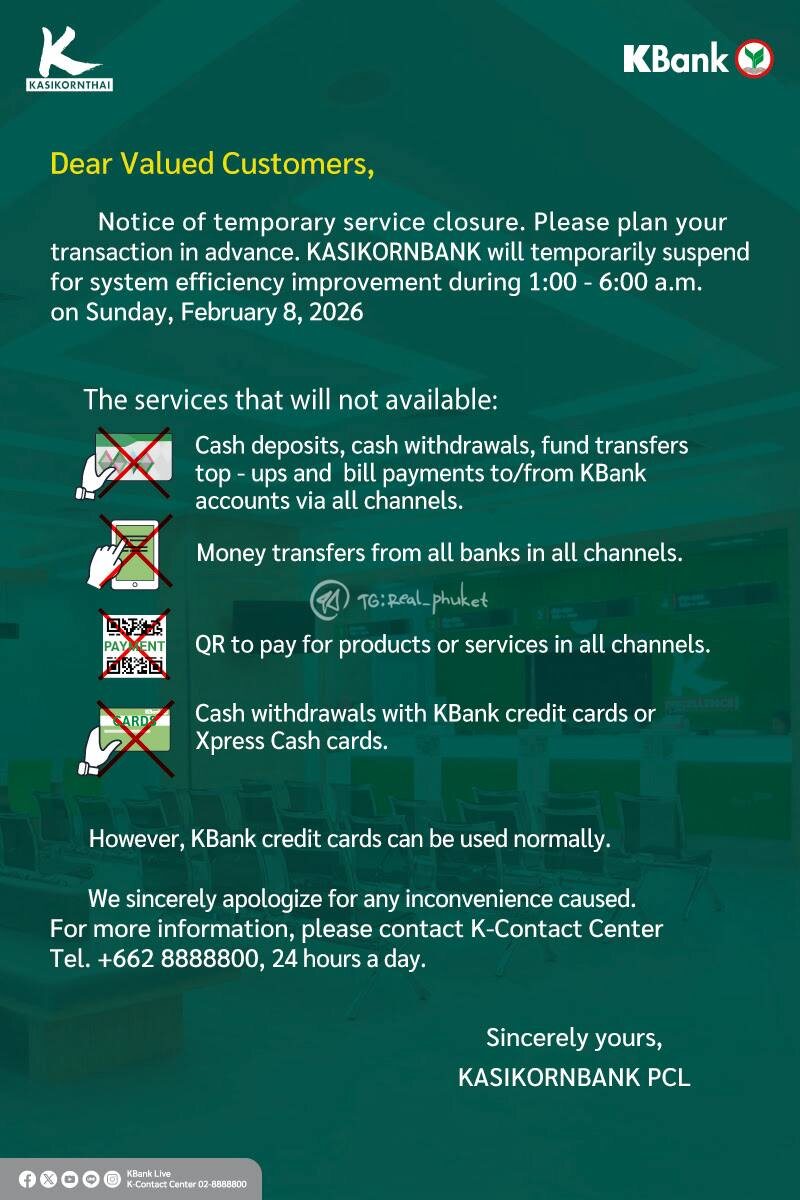 Касикорн предупреждает что временно возможность оплат и транзакций частично будет ограничена 8 февраля с 01:00 до 06:00.