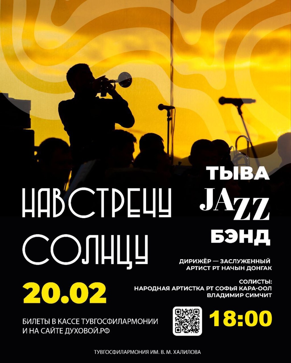 ! Приглашаем вас 20 февраля в 18:00 на концерт «Тува Джаз Бэнда» - НАВСТРЕЧУ СОЛНЦУ, Солисты Софья Кара-оол и Владимир Симчит. Будем рады видеть вас на джазовом вечере! Купить билеты: clck.ru/3RdCK6