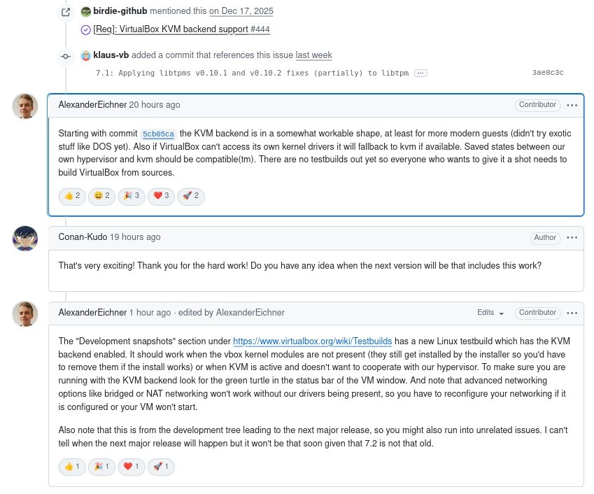 📝 Кратко: В репозитории системы виртуализации VirtualBox представлены изменения, позволяющие использовать встроенный в ядро Linux гипервизор KVM вместо специфичного модуля ядра VirtualBox (vboxdrv). Текущая реализация подготовлена сотрудниками Oracle и развивается отдельно от набора патчей VirtualBox‑KVM, поддерживаемого компанией Cyberus Technology. Читать далее 🔗 Читать оригинальную статью (ссылка) 📊 Источник: Habr ⏰ Время: 06.02.2026 03:43 📱 Другие каналы: 🪙 ВКрипту | 🎮 ВИгрухи | 🏎️ ВТачки | ✈️ ВТравелу #gadgets #гаджеты #технологии 🎉 Залетайте скорее: Я видел, как люди с нуля собирают редкие коллекции Steam… | InsideAds Бесплатные подписчики