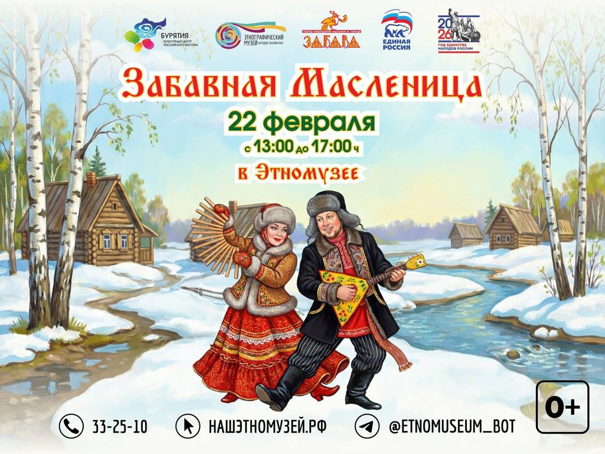 » 🌞 📆 22 февраля 🕐 с 13:00 до 17:00 В программе: - концертно-игровая программа с зажигательными ведущими. - выступления любимых ансамблей и артистов - «Забава», «Раздолье», «Сибирский сувенир», «Ликование», «Забайкал», а также специальные гости праздника. - традиционные народные игры и забавы: «молодецкие потехи», «девичьи забавы», крафтовые игры в «избе-игральне» и восхождение на «ледовый столб». - призы и подарки на каждой игровой площадке. - большой фуд-корт и много вкусных угощений. - горячие блины и ароматный чай из самовара от одного из лучших заведений нашего города. - невероятно яркие и стильные фотозоны для фото на память! Кульминацией праздника и проводов зимы станет торжественное сожжение чучела Масленицы. ❗️Для удобства гостей организована бесплатная парковка (напротив «Оранж Хаус», пос.Верхняя Березовка, 37), от которой каждые 10 минут будут курсировать бесплатные автобусы в музей и обратно. Справки по телефону: 33-25-10. Возрастное ограничение 0+. Не упустите воз