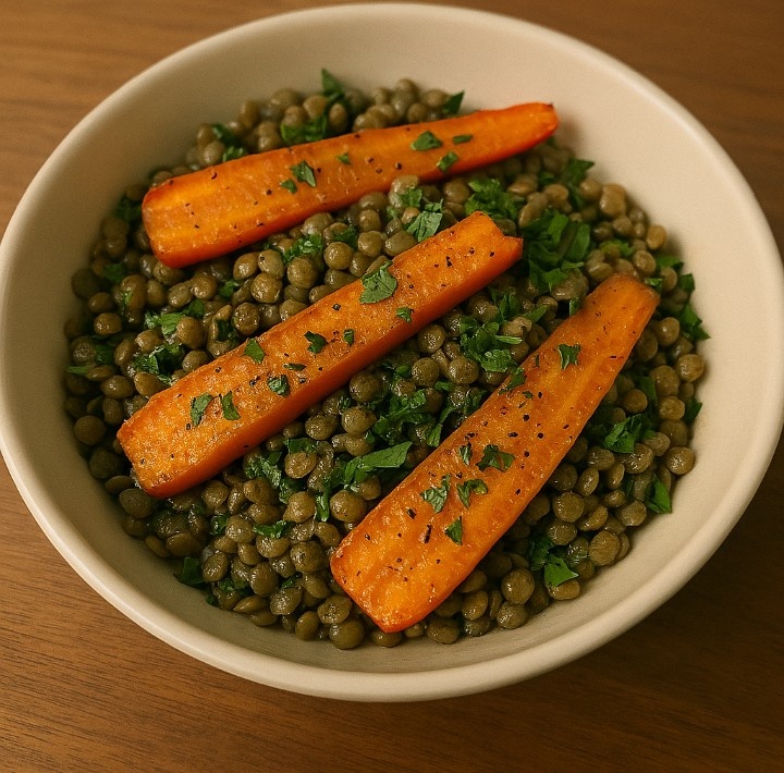 Когда морковка выходит из духовки — мягкая, янтарная, с хрустящими краями — она отправляется в миску к чечевице.