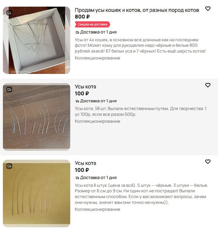 Необычные лоты все чаще появляются на сайтах объявлений. Жители региона собирают выпавшие вибриссы и выставляют их на продажу. Стоимость зависит от редкости породы и даже даты сбора. Такой материал охотно покупают мастера по изготовлению кукол и моделей кораблей. Усы идеально имитируют струны миниатюрных гитар или тонкие антенны. Суеверные покупатели используют находки как талисманы. Считается, что кошачий ус в кошельке притягивает богатство и приносит удачу на важных сделках. Ветеринары напоминают, что для продажи подходят только те волоски, которые кот потерял сам. Специально состригать усы нельзя, так как это лишает питомца ориентации в пространстве.