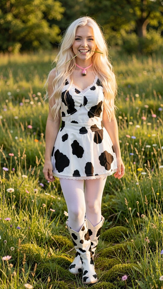 ! 🐄 Создадим игривый портрет в костюме коровы с идеальной детализацией росы и текстур в золотой час и попробуем оживить его в t.me/AAGVideoBot 📝 Оптимизированный промт: A stunning young woman with long, flowing platinum blonde hair and delicate features, joyfully posing outdoors in a lush green meadow filled with wildflowers and moss. She is wearing a highly detailed, adorable cowgirl costume – a white and black cow-print two-piece outfit with white striped stockings and matching knee-high boots adorned with cow print. Her expression is radiant and genuinely happy, with a wide, bright smile revealing slightly crooked teeth and a playful sparkle in her eyes. A small pink bell choker necklace hangs around her neck, featuring a tiny bell. She has a slender blade of grass delicately stuck between her lips. The lighting is warm and golden hour, creating soft shadows and emphasizing the natural textures of the meadow. Focus on intricate details like the texture of her hair, the patterns o