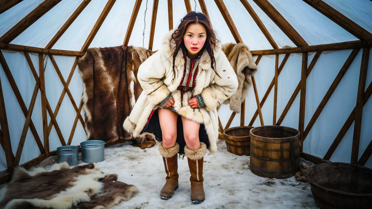 Айна выходит наружу. Морозный воздух щиплет щёки, но она не ёжится — привыкла. Вокруг тишина, нарушаемая лишь скрипом снега под ногами да далёким звоном колокольчиков на оленьих шеях.