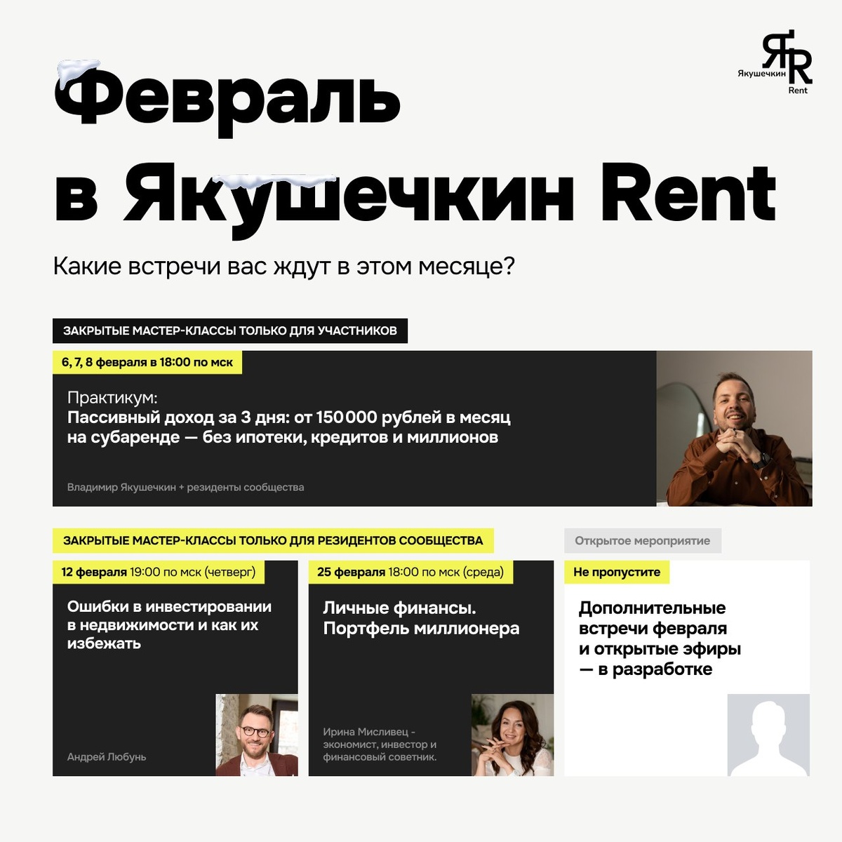 ЗАКРЫТЫЕ МАСТЕР-КЛАССЫ ТОЛЬКО ДЛЯ УЧАСТНИКОВ ✅ 6, 7, 8 февраля в 18:00 мск Практикум: Пассивный доход за 3 дня:от 150 000 рублей в месяц на субаренде — без ипотеки, кредитов и миллионов Спикер: Владимир Якушечкин + резиденты сообщества ЗАКРЫТЫЕ МАСТЕР-КЛАССЫ ТОЛЬКО ДЛЯ РЕЗИДЕНТОВ СООБЩЕСТВА 🤍 ✅ 12 февраля 19:00 мск «Ошибки в инвестировании в недвижимости и как их избежать» Спикер: Андрей Любунь ✅ 25 февраля 18:00 мск «Личные финансы. Портфель миллионера» Спикер: Ирина Мисливец ⏰ ОТКРЫТЫЕ МАСТЕР-КЛАССЫ В разработке, не пропустите апдейты о них в канале 😉 А пока напишите в комментариях, мероприятие по какой теме, связанной с субарендой, вам хотелось бы посетить?