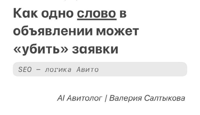 Есть момент, который многие недооценивают. И именно из-за него чаще всего появляются заявки «не те». Речь про SEO-логику Авито. На Авито любое слово в заголовке или тексте работает не только для человека, но и для алгоритма. Если вы используете формулировку, чтобы подсветить проблему для нужной ЦА, алгоритм воспринимает это буквально — как повод показывать объявление по этому слову. Иногда это играет против вас. Пример из практики. ➡️В объявлении юриста есть фраза: «споры с турагентами и туроператорами». Для человека — это просто уточнение специализации. Для алгоритма — сигнал показывать объявление по запросам «турагент», «туроператор». И что мы видим дальше в статистике: — показы по нерелевантным запросам — клики без намерения — падение CTR — заявки не по формату Бюджет тратится. А объявление постепенно «уезжает» не туда. На Авито есть полезный инструмент, которым до сих пор пользуются немногие — ➡️«Место в поиске»⬅️ Он показывает: по каким поисковым запросам ваше объявлени