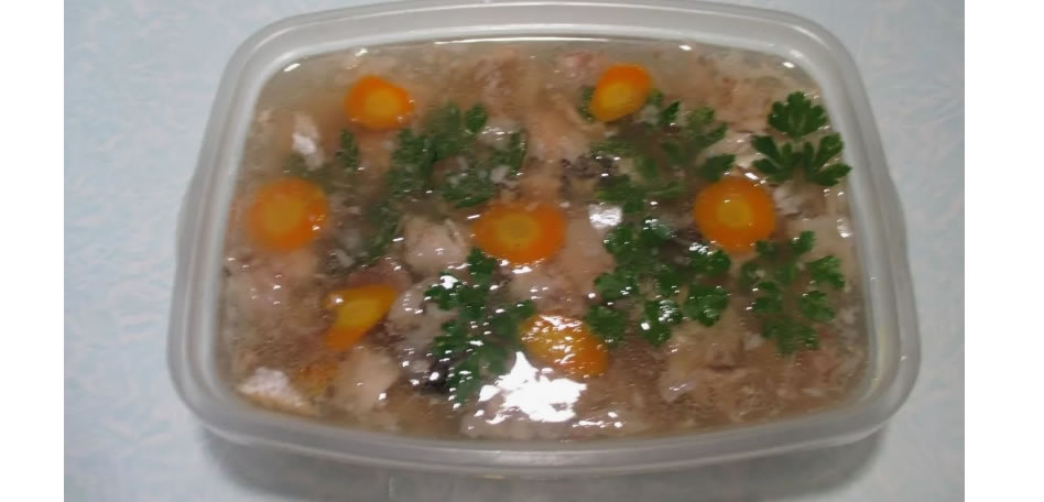 - Украсьте готовый холодец кусочками моркови, зеленью или ломтиками лимона перед заливкой бульона.