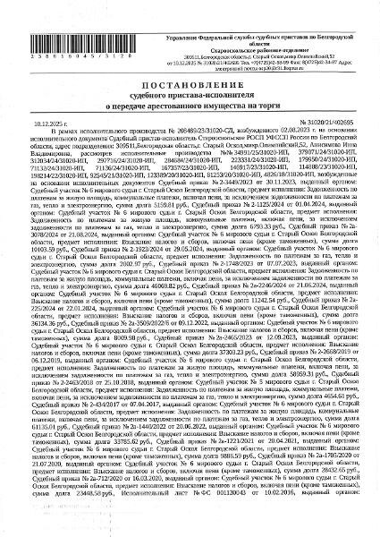 м, кадастровый номер 31:05:0509007:37. Имущество обременено: арест, запрещение регистрации. Имущество принадлежит на праве собственности Гречка А.Н. Основание реализации: постановление о передаче арестованного имущества на торги от 10.12.2025 № 31020/21/402695 Старооскольского РОСП Канал: Госземля Белгородская область Область: обл Белгородская Местоположение установлено относительно ориентира Район: расположенного в границах участка. Почтовый адрес ориентира: Белгородская область Населенный пункт: р-н Старооскольский, с. Хорошилово Локация: Смотреть на карте ВРИ: Для ведения личного подсобного хозяйства (приусадебный земельный участок) Кадастровый номер: 31:05:0509007:37 Кадастровая стоимость: - Вид сделки: Продажа Площадь: 6801 м² Начальная цена: 503000.00 руб. Дата завершения: 10.03.2026 Подробнее: ГИС ТОРГИ #госземля #земляотгосударства #земля #земельныйучасток #земельныеторги #торги #аукцион #продажаземли #продажа #белгородскаяобласть
