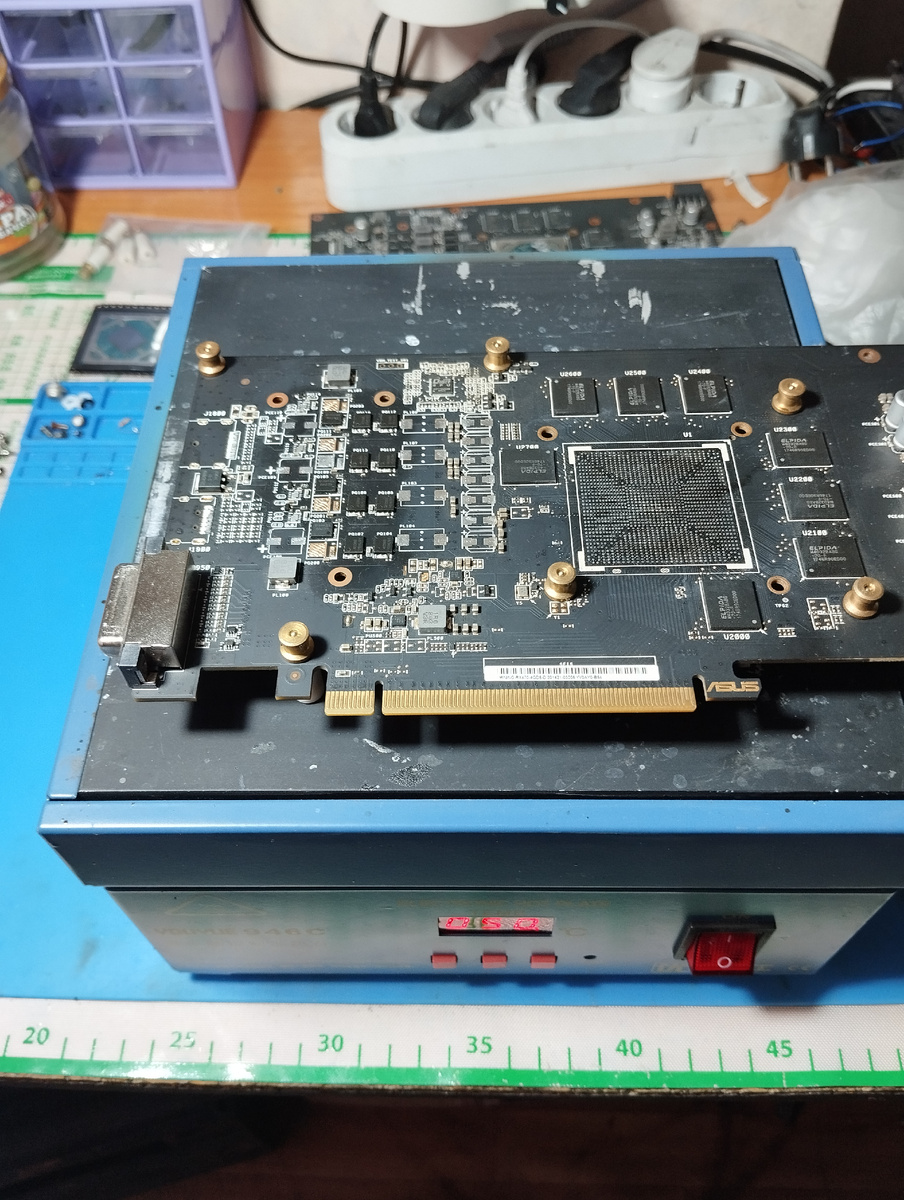 без исправного VRM установка GPU бессмысленна Перед нагрузкой: Осциллограф показал: фото делать не стал, они точно такие же как во второй части ремонта. После сборки: Проведены стресс-тесты: Под нагрузкой: Температуры стабильные, перегрева нет. В результате: Это был самый сложный ремонт из в