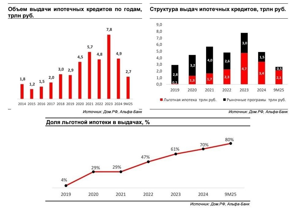 Сейчас на пальцах мы с Графономикой объясним, что случилось на рынке жилья и куда это все приведёт. А оно обязательно приведёт. Если вы все пропустили и не читаете наш новостной канал Фак санкциям, то вчера я писал, что крупнейший застройщик России Самолет запросил у государства поддержку в 50 млрд рублей. На покушать. Пока там думают, пишем, что будет дальше. Никто из собеседников Forbes не считает, что примеру «Самолета» последуют другие девелоперы. Российский стройкомплекс включил антикриз. И привлек для этого целый Forbes. Но глупо отрицать огромную, системную проблему, и еще хуже заметать сор под ковер. Российская постковидная модель льготного кредитования недвижимости рано или поздно привела бы либо к бюджетному кризису, либо к кризису у строителей. 4 из 5 ипотек, выданных в прошлом году, — по госпрограммам. Совокупный портфель выданных льготных ипотек на конце 2025 года приблизится к 16 трлн рублей (расчётные данные на цифрах Альфа-Банка). И эта сумма стремительно растёт: в