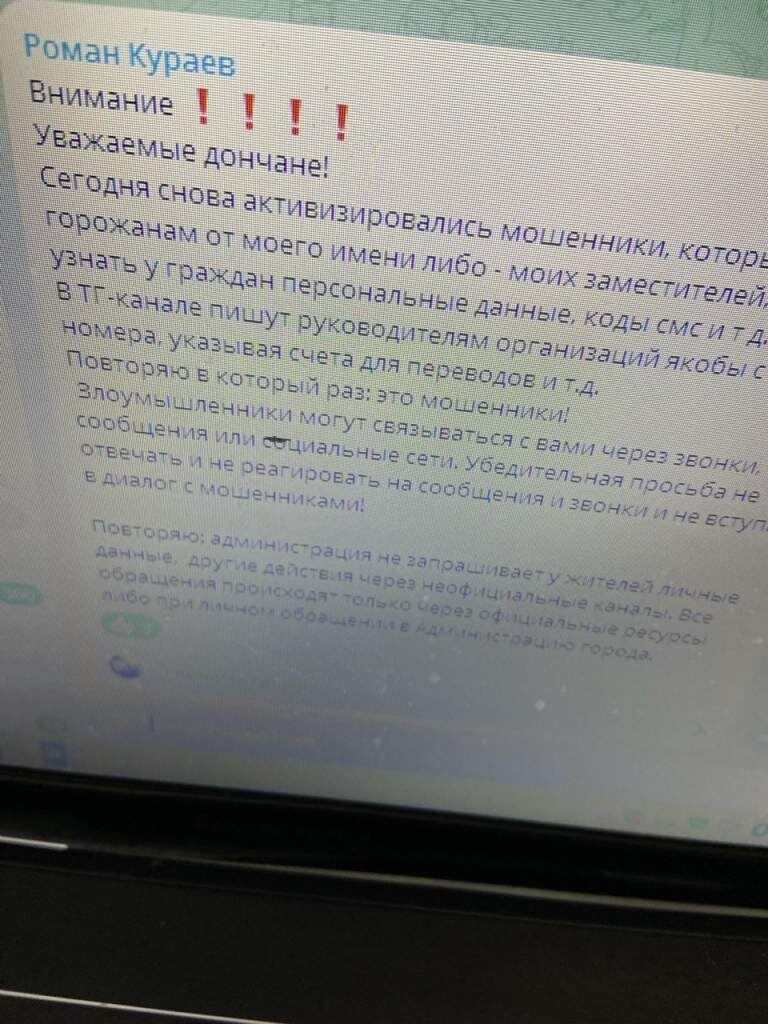 - Уважаемые дончане, сегодня снова уже несколько человек получили сообщения в мессенджер якобы от моего имени. Это мошенники. Будьте осторожны, не реагируйте на их уловки! Не дайте себя обмануть! – обратился глава города к дончанам.