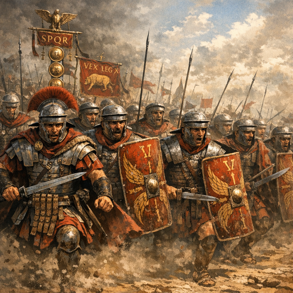 Гастаты — римские легионеры первого ряда — несли наибольший риск в рукопашной схватке, но их шансы выжить определялись дисциплиной построения, тактикой и силой врага. Благодаря смене рядов и надежному защитному доспеху многие из них переживали бой, если сражение не скатывалось в полный хаос. Римляне отвергли греческую фалангу с длинными копьями, перейдя к манипулярному строю, в котором центурии по 80–120 воинов располагались в шахматном порядке. Это обеспечивало высокую маневренность: передние ряды гастатов (молодые бойцы 21–25 лет) плотно смыкали тяжелые щиты скутумы, создавая непрерывную стену, а задние линии — принципы и триарии — стояли наготове для ротации. Гастаты принимали на себя основной натиск в первой атаке, но центурионы с помощью свистка или палки мгновенно заменяли раненых, запечатывая пробоины в шеренгах. Такая выучка, отточенная на марш-бросках с 20–30 кг снаряжения, повышала шансы на выживание всего отряда: даже при отходе формация оставалась сплоченной, что резко сни