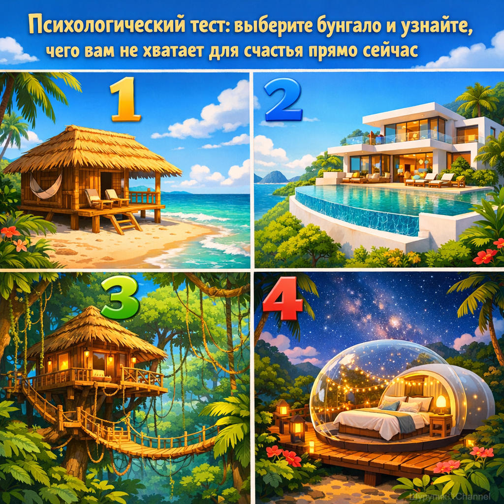 Приветствую, друзья! 👋 В прошлом тесте мы разбирались с чемоданами и пультами, выясняя ваш стиль путешествий. Но сегодня я предлагаю копнуть чуть глубже.🌞 Представьте: вы прилетели в Таиланд (или любой другой тропический рай). Никаких забот, телефон ловит только вайб расслабления, а работа осталась где-то в другой галактике. Вам предлагают выбрать идеальное жилье на ближайшую неделю. Денег с вас не возьмут, выбирайте сердцем! 😺 Посмотрите на эти 4 варианта и выберите тот, в который хочется телепортироваться прямо сейчас. Выбрали? На самом деле, вы выбрали не просто жилье, а состояние души. Давайте узнаем, какое тотемное животное в вас дремлет и какого «витамина счастья» вам сейчас не хватает! ⬇️ РЕЗУЛЬТАТЫ ТЕСТА 1. Вы выбрали бунгало «Робинзон» 🐢 Ваше тотемное животное: мудрая морская черепаха. О вас: вы — человек-дзен. В обычной жизни вы можете быть кем угодно, но в душе вы стремитесь к простоте и ясности. Вам не нужны золотые унитазы, чтобы чувствовать себя счастливым. Ваша с