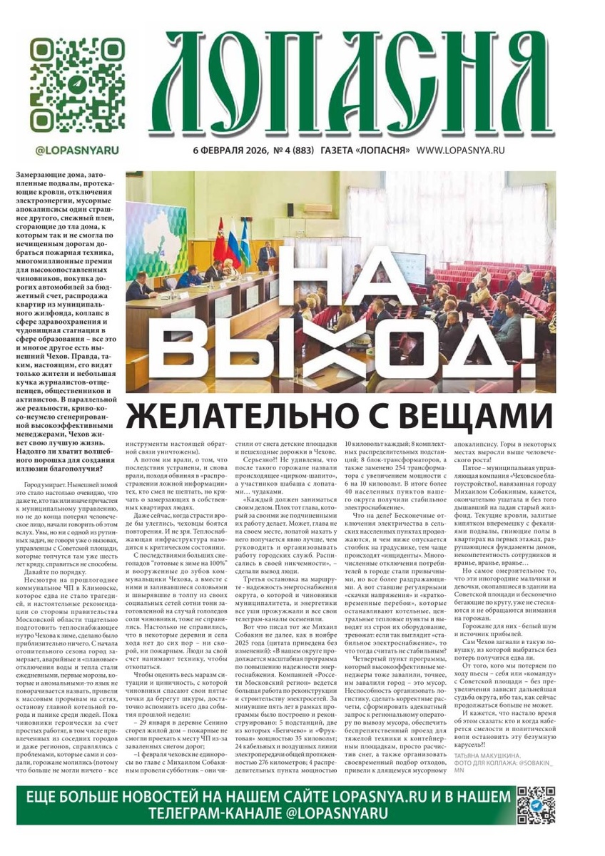 💯💯💯💯 ВЫШЕЛ В СВЕТ 4-Й В 2026 ГОДУ НОМЕР ЕЖЕНЕДЕЛЬНИКА «ЛОПАСНЯ» Читайте в газете: 📻НА ВЫХОД! ЖЕЛАТЕЛЬНО С ВЕЩАМИ. Иногородние мальчики и девочки, окопавшиеся в здании на Советской площади, загнали Чехов в опасную ловушку. Настало время остановить это безумие. 📻ПОЛИТИЧЕСКИЕ ИМПОТЕНТЫ С РЫЛЬЦЕМ В ПУШКУ. Совет депутатов Чехова в очередной раз «спустил на тормозах» тему распродажи за бесценок муниципальных квартир чиновникам и их приближенным. 📻ГДЕ ДЕНЬГИ, ЗИНА? Если управляющая компания не реагирует, юристы советуют собственникам не ждать, а брать дело в свои руки. 📻МЫ ПОТЕРЯЛИ НАДЕЖДУ. Увольнение заместителя главы Надежды Чернятиной в чеховских учреждениях культуры отметили овациями. Сотрудники ДК и библиотек надеются, что теперь их «перестанут кошмарить малолетние самодурки». 📻С ДНЕМ РОЖДЕНИЯ, АНТОН ПАВЛОВИЧ. Актуальный мотив о расхождении слова и дела волновал и Чехова. Больше века прошло, а положение дел не изменилось. Также в номере: НОВОСТИ, ПИСЬМА ЧИТАТЕЛЕЙ, ОБЪЯ