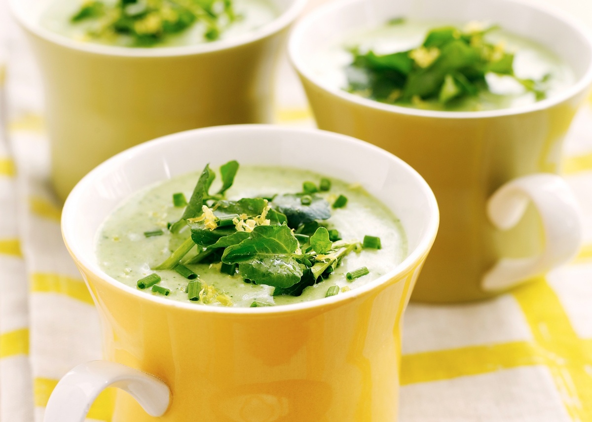 - Подавайте в охлаждённых суповых чашах, украсив свежей зеленью и несколькими каплями сливок.