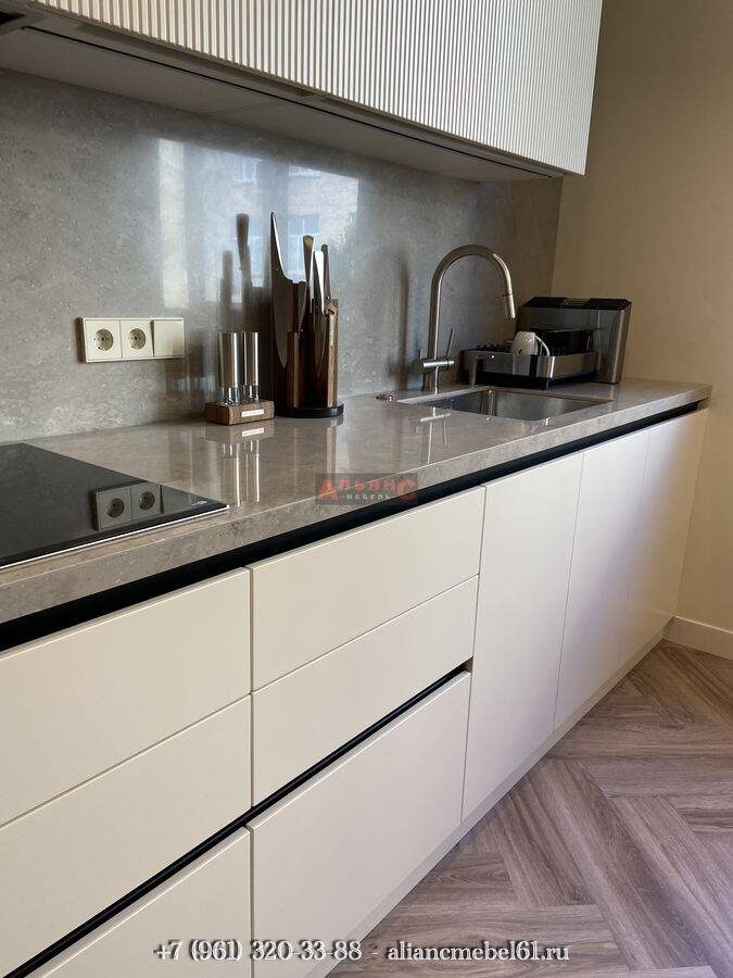 - Столешница: кварц «Calacatta Oro» толщиной 20 мм – белые прожилки связывают палитру.