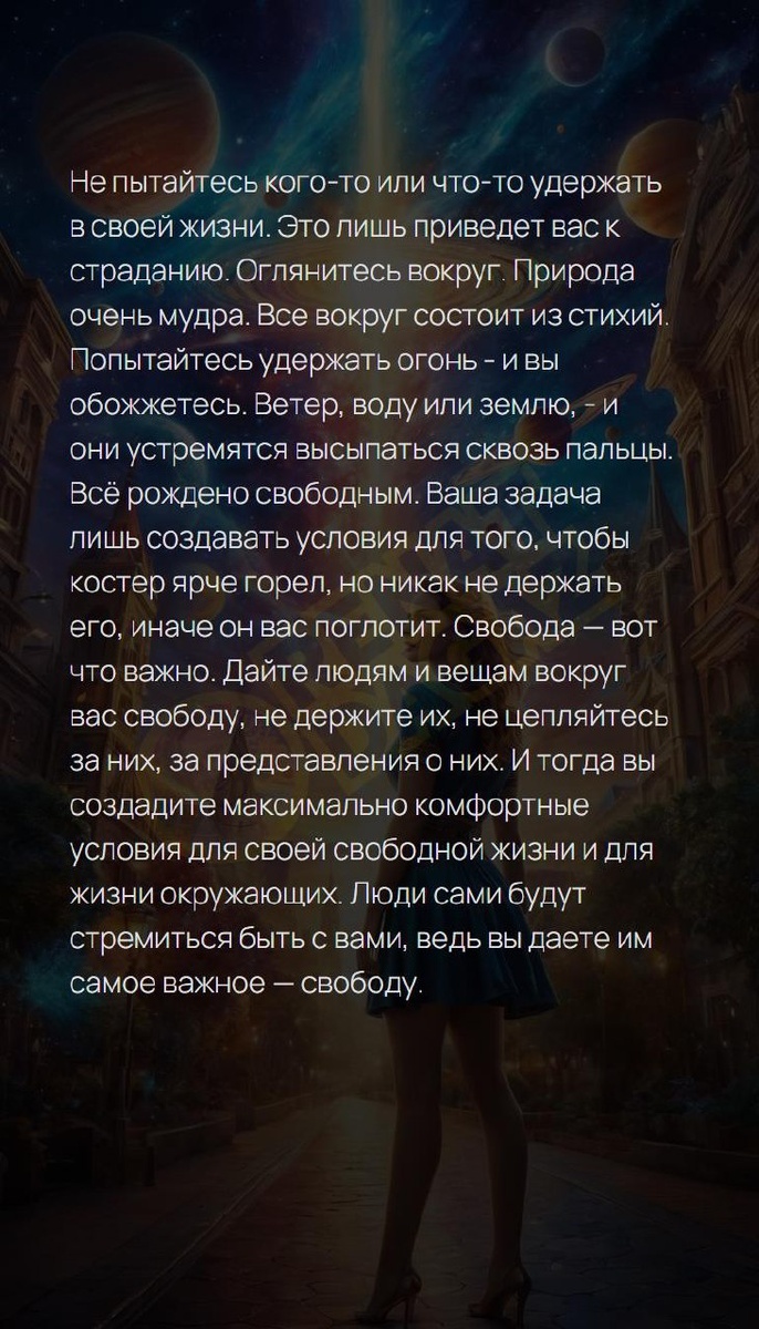 Это лиш... Не пытайтесь кого-то или что-то удержать в своей жизни. Это лишь приведет вас к страданию. Оглянитесь вокруг. Природа очень мудра. Все вокруг состоит из стихий. Попытайтесь удержать огонь - и вы обожжетесь. Ветер, воду или землю, - и они устремятся высыпаться сквозь пальцы. Всё рождено свободным. Ваша задача лишь создавать условия для того, чтобы костер ярче горел, но никак не держать его, иначе он вас поглотит. Свобода — вот что важно. Дайте людям и вещам вокруг вас свободу, не держите их, не цепляйтесь за них, за представления о них. И тогда вы создадите максимально комфортные условия для своей свободной жизни и для жизни окружающих. Люди сами будут стремиться быть с вами, ведь вы даете им самое важное — свободу. Архитектура вашей души | Натальная карта T | VK | Pin | YouTub | Dzen #личность #блог #гармониятела #здоровье #шанс #важное #встреча #новаяжизнь #магияжизни #6число #6февраля