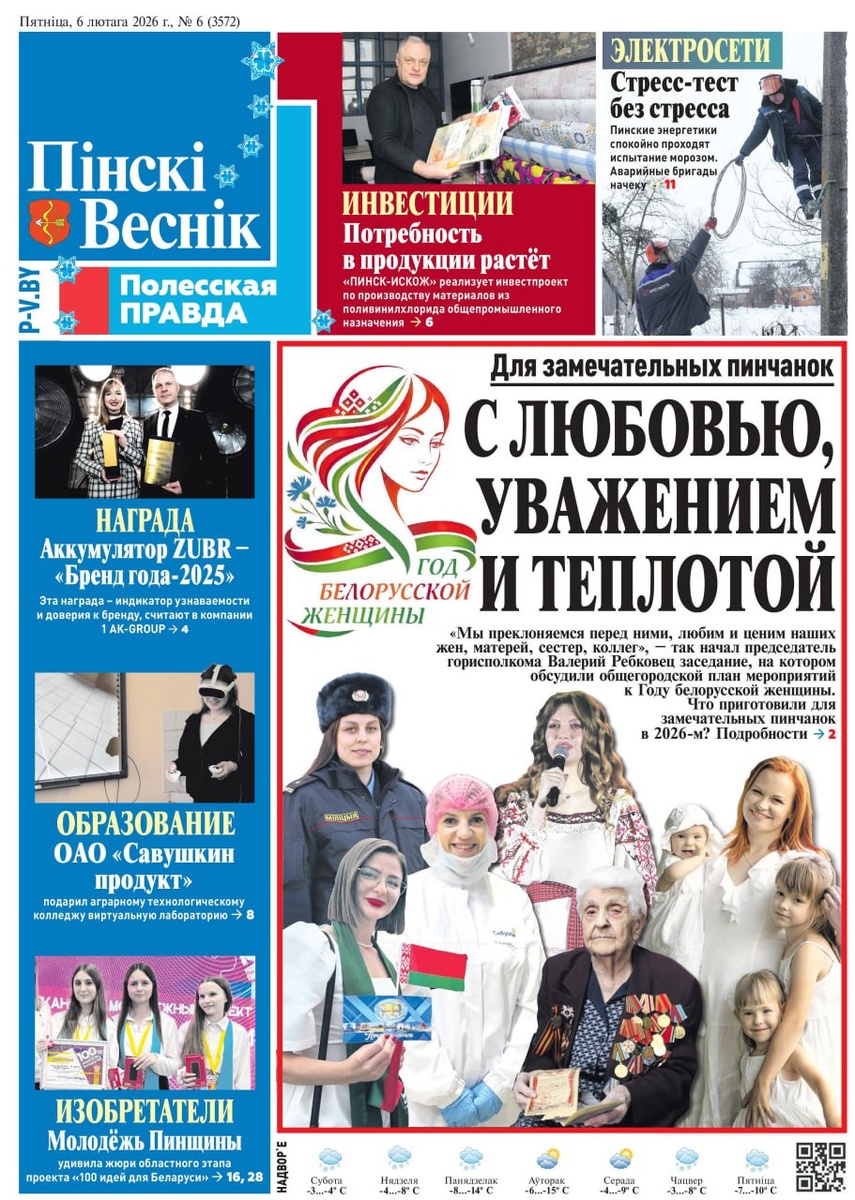 📌В центре внимания: инвестиции и рост производства — «ПИНСК-ИСКОЖ» реализует проект по выпуску материалов из ПВХ общепромышленного назначения. ⏩Есть повод для гордости: аккумулятор ZUBR признан «Брендом года-2025» — в АК-GROUP отмечают, что награда подтверждает узнаваемость и доверие к марке. ✅Хорошие новости для образования: ОАО «Савушкин продукт» подарил аграрному технологическому колледжу виртуальную лабораторию. Вдохновляет молодёжь: участники из Пинщины ярко заявили о себе на областном этапе проекта «100 идей для Беларуси». ⏩И о важном для безопасности: пинские энергетики проходят «морозный» стресс-тест уверенно — аварийные бригады наготове. ⏩Также в номере: в горисполкоме подвели итоги минувшей пятилетки, на итоговом медицинском совете определили задачи на 2026 год, а в Пинске торжественно открыли обновлённое здание межрайонной инспекции охраны животного и растительного мира. 🔵Читайте свежий «Пінскі веснік» @Пинский Вестник 📱Ютуб 📱ВК 📱ИНСТАГРАМ 📱ОК 📱ФЕЙСБУК 📱ТИК Т